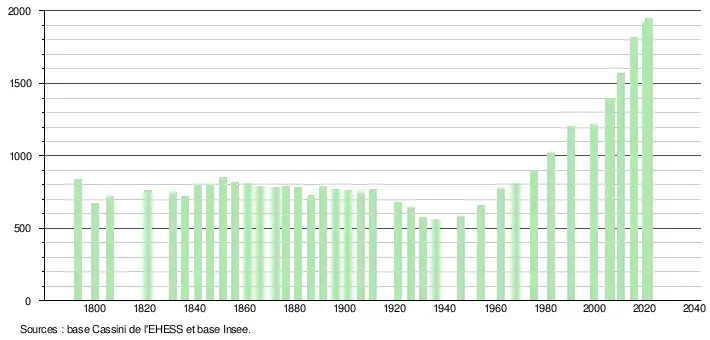 L'évolution du nombre d'habitants est connue à travers les recensements de la population effectués dans la commune depuis 1793. Pour les communes de moins de 10 000 habitants, une enquête de recensement portant sur toute la population est réalisée tous les cinq ans, les populations légales des années intermédiaires étant quant à elles estimées par interpolation ou extrapolation[33]. Pour la commune, le premier recensement exhaustif entrant dans le cadre du nouveau dispositif a été réalisé en 2005[34].