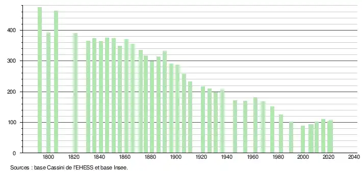 L'évolution du nombre d'habitants est connue à travers les recensements de la population effectués dans la commune depuis 1793. Pour les communes de moins de 10 000 habitants, une enquête de recensement portant sur toute la population est réalisée tous les cinq ans, les populations légales des années intermédiaires étant quant à elles estimées par interpolation ou extrapolation[20]. Pour la commune, le premier recensement exhaustif entrant dans le cadre du nouveau dispositif a été réalisé en 2005[21].