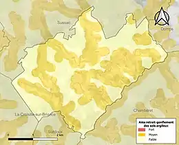 Le retrait-gonflement des sols argileux est susceptible d'engendrer des dommages importants aux bâtiments en cas d’alternance de périodes de sécheresse et de pluie[17]. 55 % de la superficie communale est en aléa moyen ou fort (27 % au niveau départemental et 48,5 % au niveau national métropolitain)[Carte 2]. Depuis le , en application de la loi ÉLAN, différentes contraintes s'imposent aux vendeurs, maîtres d'ouvrages ou constructeurs de biens situés dans une zone classée en aléa moyen ou fort[Note 2],[18].