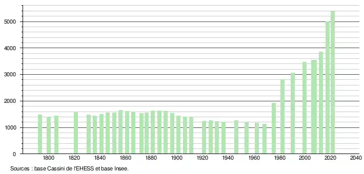 L'évolution du nombre d'habitants est connue à travers les recensements de la population effectués dans la commune depuis 1793. Pour les communes de moins de 10 000 habitants, une enquête de recensement portant sur toute la population est réalisée tous les cinq ans, les populations légales des années intermédiaires étant quant à elles estimées par interpolation ou extrapolation[26]. Pour la commune, le premier recensement exhaustif entrant dans le cadre du nouveau dispositif a été réalisé en 2007[27].