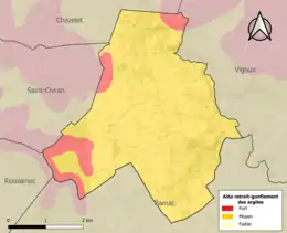 Le retrait-gonflement des sols argileux est susceptible d'engendrer des dommages importants aux bâtiments en cas d’alternance de périodes de sécheresse et de pluie. La totalité de la commune est en aléa moyen ou fort (84,7 % au niveau départemental et 48,5 % au niveau national). Sur les 98 bâtiments dénombrés sur la commune en 2019, 98 sont en aléa moyen ou fort, soit 100 %, à comparer aux 86 % au niveau départemental et 54 % au niveau national. Une cartographie de l'exposition du territoire national au retrait gonflement des sols argileux est disponible sur le site du BRGM[21],[22].