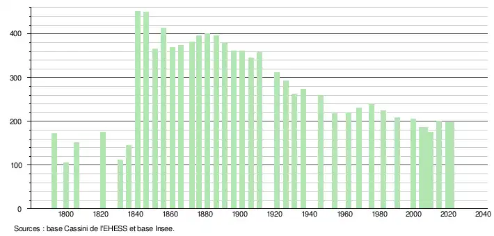 L'évolution du nombre d'habitants est connue à travers les recensements de la population effectués dans la commune depuis 1793. Pour les communes de moins de 10 000 habitants, une enquête de recensement portant sur toute la population est réalisée tous les cinq ans, les populations légales des années intermédiaires étant quant à elles estimées par interpolation ou extrapolation[47]. Pour la commune, le premier recensement exhaustif entrant dans le cadre du nouveau dispositif a été réalisé en 2004[48].