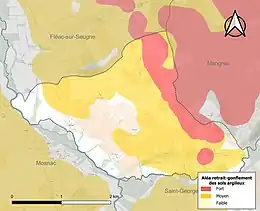 Le retrait-gonflement des sols argileux est susceptible d'engendrer des dommages importants aux bâtiments en cas d’alternance de périodes de sécheresse et de pluie. 68,4 % de la superficie communale est en aléa moyen ou fort (54,2 % au niveau départemental et 48,5 % au niveau national). Sur les 80 bâtiments dénombrés sur la commune en 2019, 64 sont en aléa moyen ou fort, soit 80 %, à comparer aux 57 % au niveau départemental et 54 % au niveau national. Une cartographie de l'exposition du territoire national au retrait gonflement des sols argileux est disponible sur le site du BRGM[12],[Carte 2].