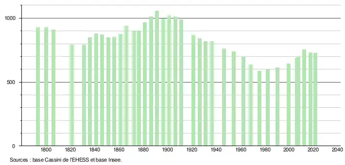 L'évolution du nombre d'habitants est connue à travers les recensements de la population effectués dans la commune depuis 1793. Pour les communes de moins de 10 000 habitants, une enquête de recensement portant sur toute la population est réalisée tous les cinq ans, les populations légales des années intermédiaires étant quant à elles estimées par interpolation ou extrapolation[20]. Pour la commune, le premier recensement exhaustif entrant dans le cadre du nouveau dispositif a été réalisé en 2007[21].