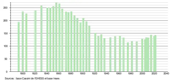 L'évolution du nombre d'habitants est connue à travers les recensements de la population effectués dans la commune depuis 1793. Pour les communes de moins de 10 000 habitants, une enquête de recensement portant sur toute la population est réalisée tous les cinq ans, les populations légales des années intermédiaires étant quant à elles estimées par interpolation ou extrapolation[23]. Pour la commune, le premier recensement exhaustif entrant dans le cadre du nouveau dispositif a été réalisé en 2004[24].