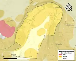 Le retrait-gonflement des sols argileux est susceptible d'engendrer des dommages importants aux bâtiments en cas d’alternance de périodes de sécheresse et de pluie. 74,5 % de la superficie communale est en aléa moyen ou fort (67,4 % au niveau départemental et 48,5 % au niveau national). Sur les 82 bâtiments dénombrés sur la commune en 2019, 60 sont en aléa moyen ou fort, soit 73 %, à comparer aux 81 % au niveau départemental et 54 % au niveau national. Une cartographie de l'exposition du territoire national au retrait gonflement des sols argileux est disponible sur le site du BRGM[19],[Carte 3].