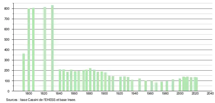 L'évolution du nombre d'habitants est connue à travers les recensements de la population effectués dans la commune depuis 1793. Pour les communes de moins de 10 000 habitants, une enquête de recensement portant sur toute la population est réalisée tous les cinq ans, les populations légales des années intermédiaires étant quant à elles estimées par interpolation ou extrapolation[35]. Pour la commune, le premier recensement exhaustif entrant dans le cadre du nouveau dispositif a été réalisé en 2004[36].