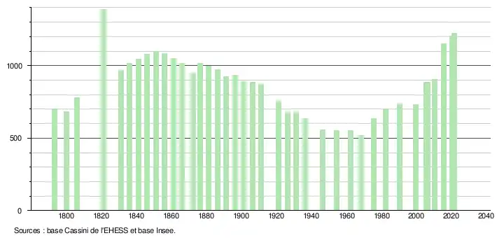 L'évolution du nombre d'habitants est connue à travers les recensements de la population effectués dans la commune depuis 1793. Pour les communes de moins de 10 000 habitants, une enquête de recensement portant sur toute la population est réalisée tous les cinq ans, les populations légales des années intermédiaires étant quant à elles estimées par interpolation ou extrapolation[21]. Pour la commune, le premier recensement exhaustif entrant dans le cadre du nouveau dispositif a été réalisé en 2005[22].