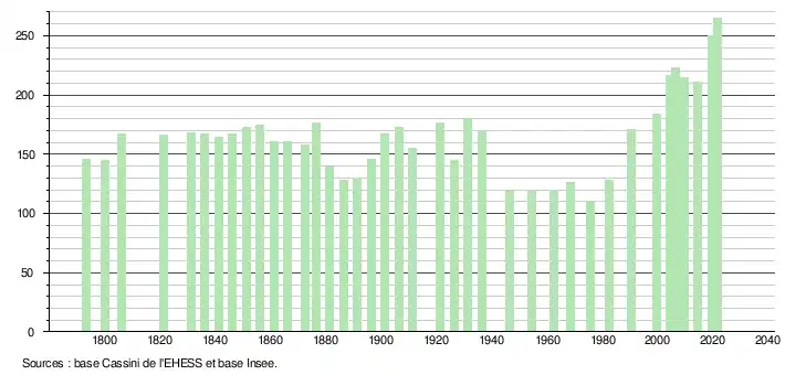 L'évolution du nombre d'habitants est connue à travers les recensements de la population effectués dans la commune depuis 1793. Pour les communes de moins de 10 000 habitants, une enquête de recensement portant sur toute la population est réalisée tous les cinq ans, les populations légales des années intermédiaires étant quant à elles estimées par interpolation ou extrapolation[23]. Pour la commune, le premier recensement exhaustif entrant dans le cadre du nouveau dispositif a été réalisé en 2004[24].