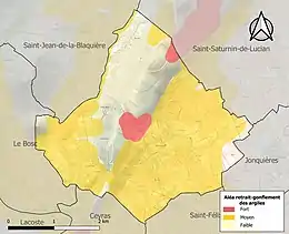 Le retrait-gonflement des sols argileux est susceptible d'engendrer des dommages importants aux bâtiments en cas d’alternance de périodes de sécheresse et de pluie. 69,9 % de la superficie communale est en aléa moyen ou fort (59,3 % au niveau départemental et 48,5 % au niveau national). Sur les 134 bâtiments dénombrés sur la commune en 2019, 132 sont en aléa moyen ou fort, soit 99 %, à comparer aux 85 % au niveau départemental et 54 % au niveau national. Une cartographie de l'exposition du territoire national au retrait gonflement des sols argileux est disponible sur le site du BRGM[17],[Carte 2].