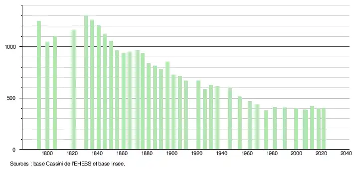 L'évolution du nombre d'habitants est connue à travers les recensements de la population effectués dans la commune depuis 1793. Pour les communes de moins de 10 000 habitants, une enquête de recensement portant sur toute la population est réalisée tous les cinq ans, les populations légales des années intermédiaires étant quant à elles estimées par interpolation ou extrapolation[22]. Pour la commune, le premier recensement exhaustif entrant dans le cadre du nouveau dispositif a été réalisé en 2007[23].