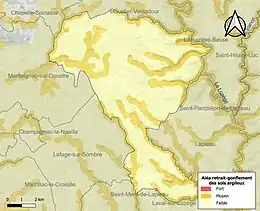 Le retrait-gonflement des sols argileux est susceptible d'engendrer des dommages importants aux bâtiments en cas d’alternance de périodes de sécheresse et de pluie. 31,2 % de la superficie communale est en aléa moyen ou fort (26,8 % au niveau départemental et 48,5 % au niveau national). Sur les 191 bâtiments dénombrés sur la commune en 2019, 19 sont en aléa moyen ou fort, soit 10 %, à comparer aux 36 % au niveau départemental et 54 % au niveau national. Une cartographie de l'exposition du territoire national au retrait gonflement des sols argileux est disponible sur le site du BRGM[16],[Carte 2].