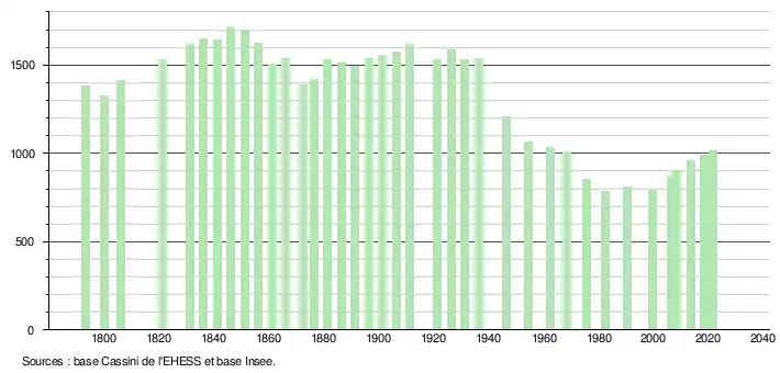 L'évolution du nombre d'habitants est connue à travers les recensements de la population effectués dans la commune depuis 1793. Pour les communes de moins de 10 000 habitants, une enquête de recensement portant sur toute la population est réalisée tous les cinq ans, les populations légales des années intermédiaires étant quant à elles estimées par interpolation ou extrapolation[25]. Pour la commune, le premier recensement exhaustif entrant dans le cadre du nouveau dispositif a été réalisé en 2008[26].