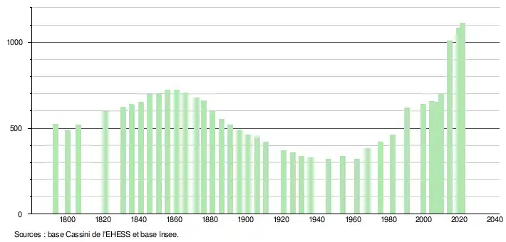 L'évolution du nombre d'habitants est connue à travers les recensements de la population effectués dans la commune depuis 1793. Pour les communes de moins de 10 000 habitants, une enquête de recensement portant sur toute la population est réalisée tous les cinq ans, les populations légales des années intermédiaires étant quant à elles estimées par interpolation ou extrapolation[22]. Pour la commune, le premier recensement exhaustif entrant dans le cadre du nouveau dispositif a été réalisé en 2004[23].
