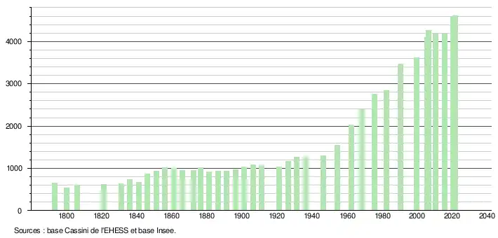 L'évolution du nombre d'habitants est connue à travers les recensements de la population effectués dans la commune depuis 1793. Pour les communes de moins de 10 000 habitants, une enquête de recensement portant sur toute la population est réalisée tous les cinq ans, les populations légales des années intermédiaires étant quant à elles estimées par interpolation ou extrapolation[33]. Pour la commune, le premier recensement exhaustif entrant dans le cadre du nouveau dispositif a été réalisé en 2005[34].