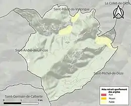 Le retrait-gonflement des sols argileux est susceptible d'engendrer des dommages importants aux bâtiments en cas d’alternance de périodes de sécheresse et de pluie. Aucune partie du territoire de la commune n'est en aléa moyen ou fort (15,8 % au niveau départemental et 48,5 % au niveau national). Sur les 118 bâtiments dénombrés sur la commune en 2019, aucun n'est en aléa moyen ou fort, à comparer aux 14 % au niveau départemental et 54 % au niveau national. Une cartographie de l'exposition du territoire national au retrait gonflement des sols argileux est disponible sur le site du BRGM[28],[Carte 2].