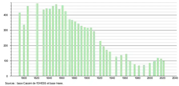 | L'évolution du nombre d'habitants est connue à travers les recensements de la population effectués dans la commune depuis 1793. Pour les communes de moins de 10 000 habitants, une enquête de recensement portant sur toute la population est réalisée tous les cinq ans, les populations légales des années intermédiaires étant quant à elles estimées par interpolation ou extrapolation[31]. Pour la commune, le premier recensement exhaustif entrant dans le cadre du nouveau dispositif a été réalisé en 2007[32]. En 2021, la commune comptait 99 habitants[Note 7], en diminution de 15,38 % par rapport à 2015 (Lozère : +0,28 %, France hors Mayotte : +1,84 %). |