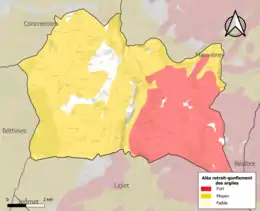 Le retrait-gonflement des sols argileux est susceptible d'engendrer des dommages importants aux bâtiments en cas d’alternance de périodes de sécheresse et de pluie. 93 % de la superficie communale est en aléa moyen ou fort (84,7 % au niveau départemental et 48,5 % au niveau national). Sur les 237 bâtiments dénombrés sur la commune en 2019, 227 sont en aléa moyen ou fort, soit 96 %, à comparer aux 86 % au niveau départemental et 54 % au niveau national. Une cartographie de l'exposition du territoire national au retrait gonflement des sols argileux est disponible sur le site du BRGM[21],[22].