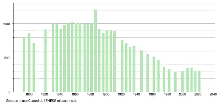 L'évolution du nombre d'habitants est connue à travers les recensements de la population effectués dans la commune depuis 1793. Pour les communes de moins de 10 000 habitants, une enquête de recensement portant sur toute la population est réalisée tous les cinq ans, les populations légales des années intermédiaires étant quant à elles estimées par interpolation ou extrapolation[30]. Pour la commune, le premier recensement exhaustif entrant dans le cadre du nouveau dispositif a été réalisé en 2006[31].