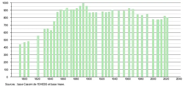 L'évolution du nombre d'habitants est connue à travers les recensements de la population effectués dans la commune depuis 1793. Pour les communes de moins de 10 000 habitants, une enquête de recensement portant sur toute la population est réalisée tous les cinq ans, les populations légales des années intermédiaires étant quant à elles estimées par interpolation ou extrapolation[19]. Pour la commune, le premier recensement exhaustif entrant dans le cadre du nouveau dispositif a été réalisé en 2007[20].
