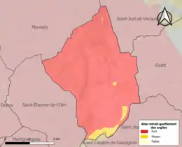 Le retrait-gonflement des sols argileux est susceptible d'engendrer des dommages importants aux bâtiments en cas d’alternance de périodes de sécheresse et de pluie. La totalité de la commune est en aléa moyen ou fort (67,5 % au niveau départemental et 48,5 % au niveau national). Sur les 109 bâtiments dénombrés sur la commune en 2019, 109 sont en aléa moyen ou fort, soit 100 %, à comparer aux 90 % au niveau départemental et 54 % au niveau national. Une cartographie de l'exposition du territoire national au retrait gonflement des sols argileux est disponible sur le site du BRGM[15],[Carte 2].