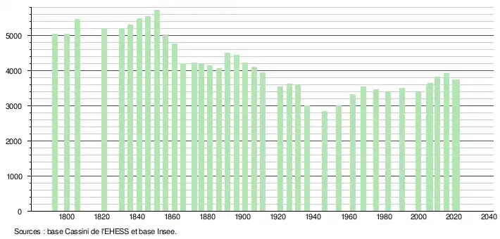 L'évolution du nombre d'habitants est connue à travers les recensements de la population effectués dans la commune depuis 1793. Pour les communes de moins de 10 000 habitants, une enquête de recensement portant sur toute la population est réalisée tous les cinq ans, les populations légales des années intermédiaires étant quant à elles estimées par interpolation ou extrapolation[28]. Pour la commune, le premier recensement exhaustif entrant dans le cadre du nouveau dispositif a été réalisé en 2005[29].