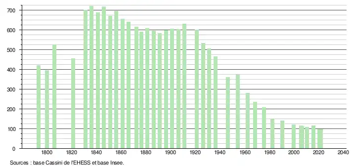 L'évolution du nombre d'habitants est connue à travers les recensements de la population effectués dans la commune depuis 1793. Pour les communes de moins de 10 000 habitants, une enquête de recensement portant sur toute la population est réalisée tous les cinq ans, les populations légales des années intermédiaires étant quant à elles estimées par interpolation ou extrapolation[12]. Pour la commune, le premier recensement exhaustif entrant dans le cadre du nouveau dispositif a été réalisé en 2005[13].