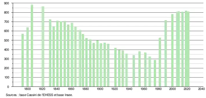 L'évolution du nombre d'habitants est connue à travers les recensements de la population effectués dans la commune depuis 1793. Pour les communes de moins de 10 000 habitants, une enquête de recensement portant sur toute la population est réalisée tous les cinq ans, les populations légales des années intermédiaires étant quant à elles estimées par interpolation ou extrapolation[17]. Pour la commune, le premier recensement exhaustif entrant dans le cadre du nouveau dispositif a été réalisé en 2008[18].