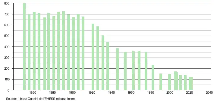 L'évolution du nombre d'habitants est connue à travers les recensements de la population effectués dans la commune depuis 1851. Pour les communes de moins de 10 000 habitants, une enquête de recensement portant sur toute la population est réalisée tous les cinq ans, les populations légales des années intermédiaires étant quant à elles estimées par interpolation ou extrapolation[38]. Pour la commune, le premier recensement exhaustif entrant dans le cadre du nouveau dispositif a été réalisé en 2005[39].