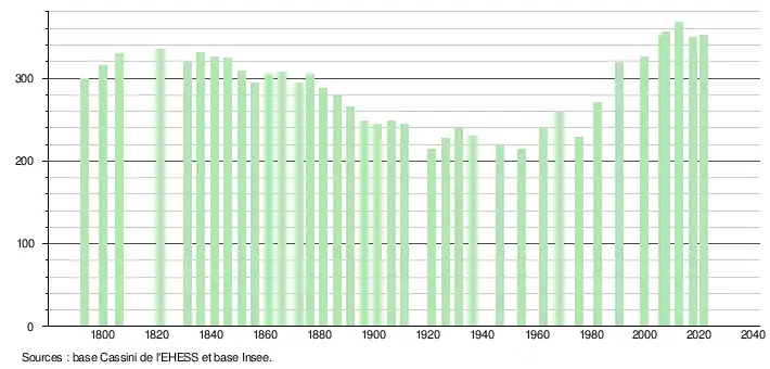 L'évolution du nombre d'habitants est connue à travers les recensements de la population effectués dans la commune depuis 1793. Pour les communes de moins de 10 000 habitants, une enquête de recensement portant sur toute la population est réalisée tous les cinq ans, les populations légales des années intermédiaires étant quant à elles estimées par interpolation ou extrapolation[27]. Pour la commune, le premier recensement exhaustif entrant dans le cadre du nouveau dispositif a été réalisé en 2007[28].