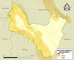 Le retrait-gonflement des sols argileux est susceptible d'engendrer des dommages importants aux bâtiments en cas d’alternance de périodes de sécheresse et de pluie[33]. 47,6 % de la superficie communale est en aléa moyen ou fort (59 % au niveau départemental et 48,5 % au niveau national)[Carte 3]. Depuis le , en application de la loi ELAN, différentes contraintes s'imposent aux vendeurs, maîtres d'ouvrages ou constructeurs de biens situés dans une zone classée en aléa moyen ou fort[Note 5],[34].