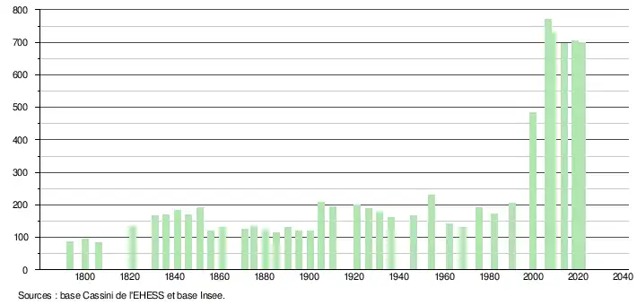 L'évolution du nombre d'habitants est connue à travers les recensements de la population effectués dans la commune depuis 1793. Pour les communes de moins de 10 000 habitants, une enquête de recensement portant sur toute la population est réalisée tous les cinq ans, les populations légales des années intermédiaires étant quant à elles estimées par interpolation ou extrapolation[17]. Pour la commune, le premier recensement exhaustif entrant dans le cadre du nouveau dispositif a été réalisé en 2008[18].
