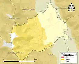 Le retrait-gonflement des sols argileux est susceptible d'engendrer des dommages importants aux bâtiments en cas d’alternance de périodes de sécheresse et de pluie[28]. 58,1 % de la superficie communale est en aléa moyen ou fort (59 % au niveau départemental et 48,5 % au niveau national)[Carte 3]. Depuis le , en application de la loi ELAN, différentes contraintes s'imposent aux vendeurs, maîtres d'ouvrages ou constructeurs de biens situés dans une zone classée en aléa moyen ou fort[Note 5],[29].