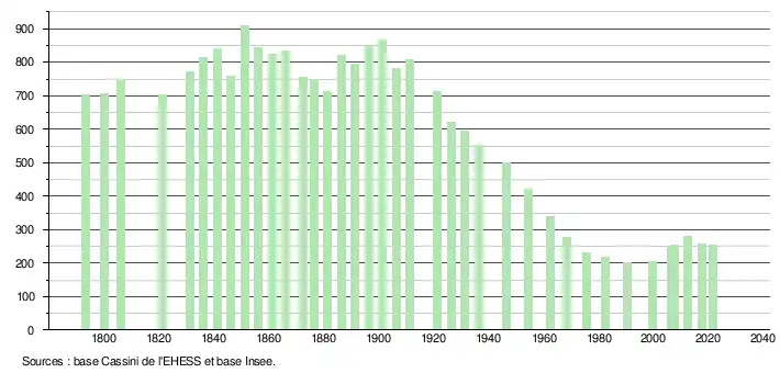 L'évolution du nombre d'habitants est connue à travers les recensements de la population effectués dans la commune depuis 1793. Pour les communes de moins de 10 000 habitants, une enquête de recensement portant sur toute la population est réalisée tous les cinq ans, les populations légales des années intermédiaires étant quant à elles estimées par interpolation ou extrapolation[21]. Pour la commune, le premier recensement exhaustif entrant dans le cadre du nouveau dispositif a été réalisé en 2007[22].