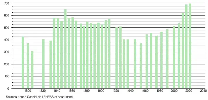 L'évolution du nombre d'habitants est connue à travers les recensements de la population effectués dans la commune depuis 1793. Pour les communes de moins de 10 000 habitants, une enquête de recensement portant sur toute la population est réalisée tous les cinq ans, les populations légales des années intermédiaires étant quant à elles estimées par interpolation ou extrapolation[16]. Pour la commune, le premier recensement exhaustif entrant dans le cadre du nouveau dispositif a été réalisé en 2006[17].