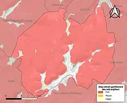 Les mouvements de terrains susceptibles de se produire sur la commune sont des tassements différentiels[37]. Le retrait-gonflement des sols argileux est susceptible d'engendrer des dommages importants aux bâtiments en cas d’alternance de périodes de sécheresse et de pluie[38]. 90,9 % de la superficie communale est en aléa moyen ou fort (58,6 % au niveau départemental et 48,5 % au niveau national métropolitain)[Carte 4]. Depuis le , en application de la loi ÉLAN, différentes contraintes s'imposent aux vendeurs, maîtres d'ouvrages ou constructeurs de biens situés dans une zone classée en aléa moyen ou fort[Note 4],[39].