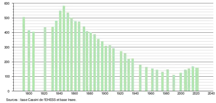- Population municipale légale en vigueur au 1er janvier 2024, millésimée 2021, définie dans les limites territoriales en vigueur au 1er janvier 2023, date de référence statistique : 1er janvier 2021.