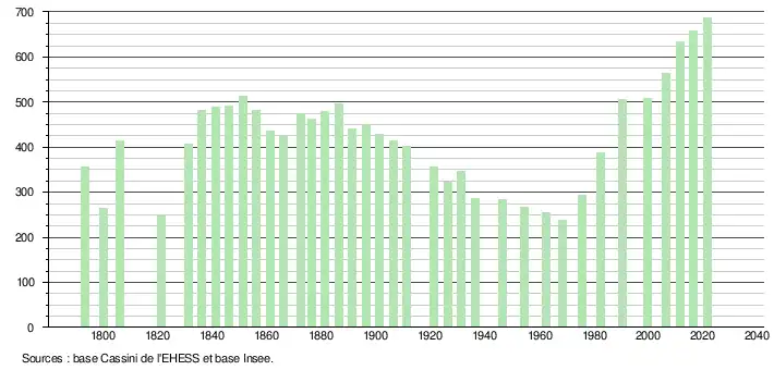 L'évolution du nombre d'habitants est connue à travers les recensements de la population effectués dans la commune depuis 1793. Pour les communes de moins de 10 000 habitants, une enquête de recensement portant sur toute la population est réalisée tous les cinq ans, les populations légales des années intermédiaires étant quant à elles estimées par interpolation ou extrapolation[19]. Pour la commune, le premier recensement exhaustif entrant dans le cadre du nouveau dispositif a été réalisé en 2006[20].