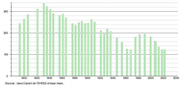 L'évolution du nombre d'habitants est connue à travers les recensements de la population effectués dans la commune depuis 1793. Pour les communes de moins de 10 000 habitants, une enquête de recensement portant sur toute la population est réalisée tous les cinq ans, les populations légales des années intermédiaires étant quant à elles estimées par interpolation ou extrapolation[26]. Pour la commune, le premier recensement exhaustif entrant dans le cadre du nouveau dispositif a été réalisé en 2007[27].
