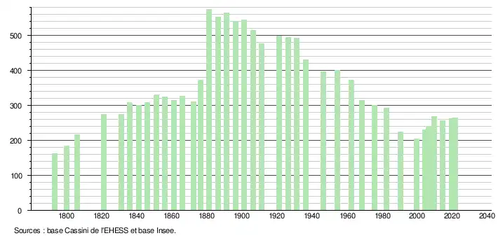 L'évolution du nombre d'habitants est connue à travers les recensements de la population effectués dans la commune depuis 1793. Pour les communes de moins de 10 000 habitants, une enquête de recensement portant sur toute la population est réalisée tous les cinq ans, les populations légales des années intermédiaires étant quant à elles estimées par interpolation ou extrapolation[28]. Pour la commune, le premier recensement exhaustif entrant dans le cadre du nouveau dispositif a été réalisé en 2004[29].