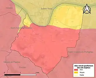 Le retrait-gonflement des sols argileux est susceptible d'engendrer des dommages importants aux bâtiments en cas d’alternance de périodes de sécheresse et de pluie. 99,9 % de la superficie communale est en aléa moyen ou fort (67,4 % au niveau départemental et 48,5 % au niveau national). Sur les 221 bâtiments dénombrés sur la commune en 2019, 221 sont en aléa moyen ou fort, soit 100 %, à comparer aux 84 % au niveau départemental et 54 % au niveau national. Une cartographie de l'exposition du territoire national au retrait gonflement des sols argileux est disponible sur le site du BRGM[25],[Carte 2].