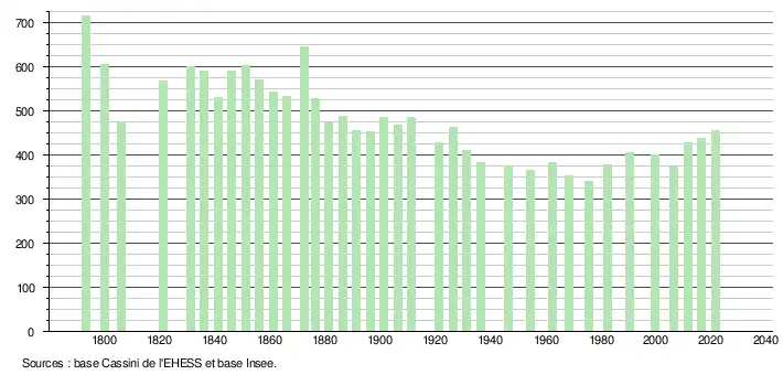 L'évolution du nombre d'habitants est connue à travers les recensements de la population effectués dans la commune depuis 1793. Pour les communes de moins de 10 000 habitants, une enquête de recensement portant sur toute la population est réalisée tous les cinq ans, les populations légales des années intermédiaires étant quant à elles estimées par interpolation ou extrapolation[29]. Pour la commune, le premier recensement exhaustif entrant dans le cadre du nouveau dispositif a été réalisé en 2006[30].