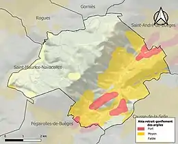 La commune est vulnérable au risque de mouvements de terrains constitué principalement du retrait-gonflement des sols argileux[25]. Cet aléa est susceptible d'engendrer des dommages importants aux bâtiments en cas d’alternance de périodes de sécheresse et de pluie. 39,3 % de la superficie communale est en aléa moyen ou fort (59,3 % au niveau départemental et 48,5 % au niveau national). Sur les 151 bâtiments dénombrés sur la commune en 2019, 150 sont en aléa moyen ou fort, soit 99 %, à comparer aux 85 % au niveau départemental et 54 % au niveau national. Une cartographie de l'exposition du territoire national au retrait gonflement des sols argileux est disponible sur le site du BRGM[26],[Carte 2].
