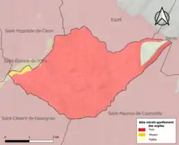 Le retrait-gonflement des sols argileux est susceptible d'engendrer des dommages importants aux bâtiments en cas d’alternance de périodes de sécheresse et de pluie. 95,7 % de la superficie communale est en aléa moyen ou fort (67,5 % au niveau départemental et 48,5 % au niveau national). Sur les 92 bâtiments dénombrés sur la commune en 2019, 92 sont en aléa moyen ou fort, soit 100 %, à comparer aux 90 % au niveau départemental et 54 % au niveau national. Une cartographie de l'exposition du territoire national au retrait gonflement des sols argileux est disponible sur le site du BRGM[15],[Carte 2].