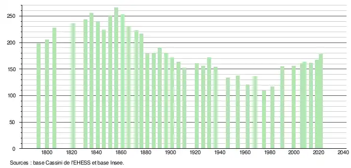 L'évolution du nombre d'habitants est connue à travers les recensements de la population effectués dans la commune depuis 1793. Pour les communes de moins de 10 000 habitants, une enquête de recensement portant sur toute la population est réalisée tous les cinq ans, les populations légales des années intermédiaires étant quant à elles estimées par interpolation ou extrapolation[18]. Pour la commune, le premier recensement exhaustif entrant dans le cadre du nouveau dispositif a été réalisé en 2008[19].
