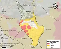 La commune est vulnérable au risque de mouvements de terrains constitué principalement du retrait-gonflement des sols argileux[22]. Cet aléa est susceptible d'engendrer des dommages importants aux bâtiments en cas d’alternance de périodes de sécheresse et de pluie. 63,8 % de la superficie communale est en aléa moyen ou fort (59,3 % au niveau départemental et 48,5 % au niveau national). Sur les 848 bâtiments dénombrés sur la commune en 2019, 383 sont en aléa moyen ou fort, soit 45 %, à comparer aux 85 % au niveau départemental et 54 % au niveau national. Une cartographie de l'exposition du territoire national au retrait gonflement des sols argileux est disponible sur le site du BRGM[23],[Carte 2].