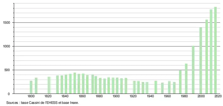 L'évolution du nombre d'habitants est connue à travers les recensements de la population effectués dans la commune depuis 1800. Pour les communes de moins de 10 000 habitants, une enquête de recensement portant sur toute la population est réalisée tous les cinq ans, les populations légales des années intermédiaires étant quant à elles estimées par interpolation ou extrapolation[12]. Pour la commune, le premier recensement exhaustif entrant dans le cadre du nouveau dispositif a été réalisé en 2006[13].