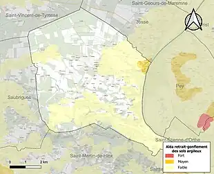 Le retrait-gonflement des sols argileux est susceptible d'engendrer des dommages importants aux bâtiments en cas d’alternance de périodes de sécheresse et de pluie. 1 % de la superficie communale est en aléa moyen ou fort (19,2 % au niveau départemental et 48,5 % au niveau national). Sur les 663 bâtiments dénombrés sur la commune en 2019, 16 sont en aléa moyen ou fort, soit 2 %, à comparer aux 17 % au niveau départemental et 54 % au niveau national. Une cartographie de l'exposition du territoire national au retrait gonflement des sols argileux est disponible sur le site du BRGM[26],[Carte 2].