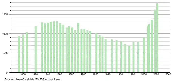 L'évolution du nombre d'habitants est connue à travers les recensements de la population effectués dans la commune depuis 1793. Pour les communes de moins de 10 000 habitants, une enquête de recensement portant sur toute la population est réalisée tous les cinq ans, les populations légales des années intermédiaires étant quant à elles estimées par interpolation ou extrapolation[29]. Pour la commune, le premier recensement exhaustif entrant dans le cadre du nouveau dispositif a été réalisé en 2007[30].
