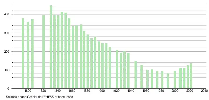 L'évolution du nombre d'habitants est connue à travers les recensements de la population effectués dans la commune depuis 1793. Pour les communes de moins de 10 000 habitants, une enquête de recensement portant sur toute la population est réalisée tous les cinq ans, les populations légales des années intermédiaires étant quant à elles estimées par interpolation ou extrapolation[25]. Pour la commune, le premier recensement exhaustif entrant dans le cadre du nouveau dispositif a été réalisé en 2007[26].